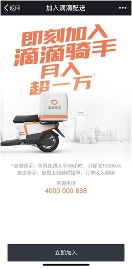 资料显示,滴滴外卖分为“忠诚骑手”和“自由骑手”,前者只需每周在线大于48小时,就可拿到月保底1万元的收入;后者可自由上线接单,订单收入翻倍。